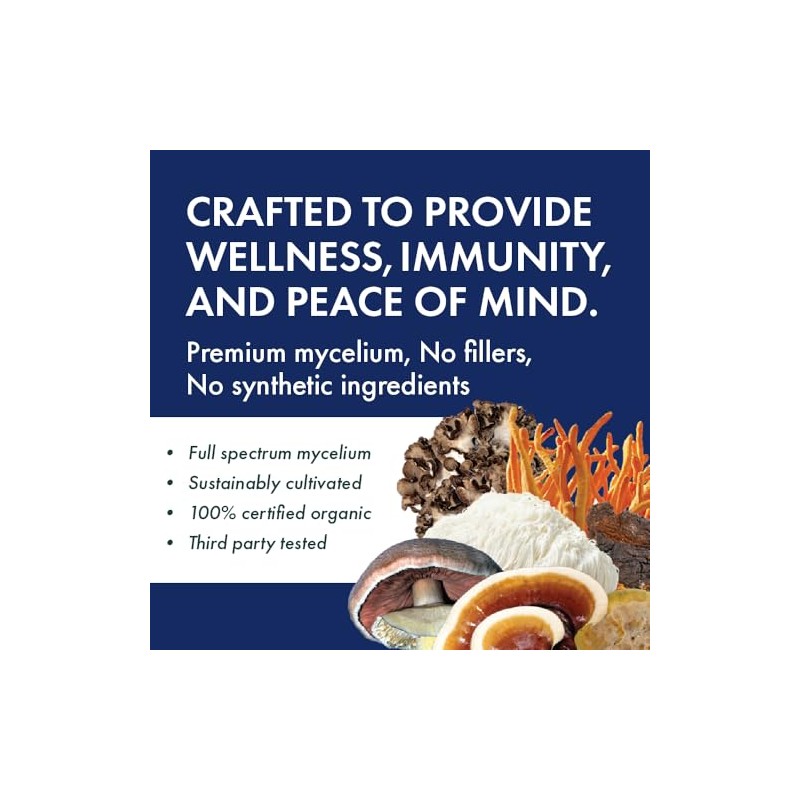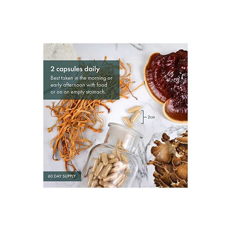 - High Potency Mushroom Blend: Contains 1,000 mg mushroom mycelium in every 2-capsule serving, including cordyceps, lion's mane, reishi, and chaga.