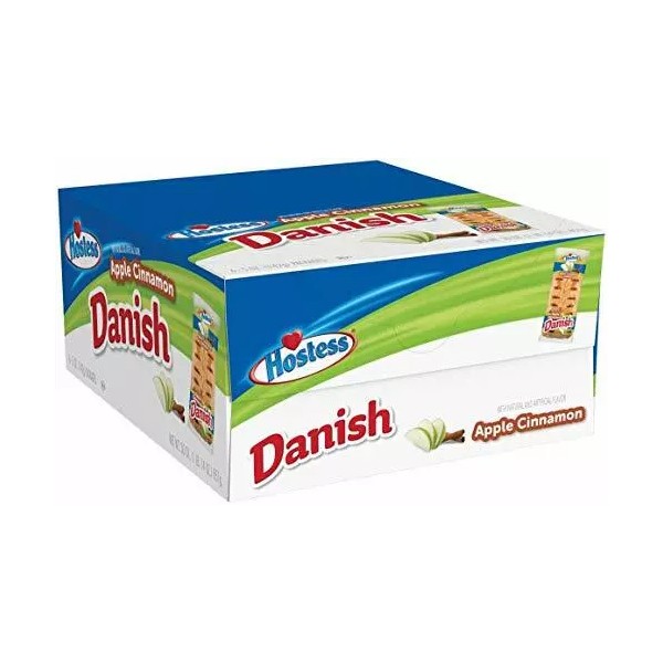 One 6 Count box of Hostess Apple Cinnamon Danish. Includes 6 individually sealed 5 Oz packages. Ingredients: Enriched Flour (Wheat Flour, Malted Barley Flour, Niacin, Ferrous Sulfate Or Reduced Iron, Thiamine Mononitrate, Riboflavin, Folic Acid), Water, Palm Oil, Sugar, Fructose, High Fructose Corn Syrup, Yeast. Contains 2% Or Less: Corn Syrup, Glycerin, Modified Cornstarch, Apple, Salt, Mono And Diglycerides, Whey, Dextrose, Natural And Artificial Flavor, Cinnamon, Malic Acid, Molasses, Apple Juice Concentrate, Nutmeg, Soybean Oil, Casein, Citric Acid, Xanthan Gum, Cellulose Gum, Cellulose Gel, Sodium Stearoyl Lactylate, Guar Gum, Mineral Oil, Soy Lecithin, Ascorbic Acid, Egg, Baking Soda, Sodium Acid Pyrophosphate, Calcium Sulfate, Preservative (Potassium Sorbate, Sodium Benzoate, Calcium Propionate, Sodium Propionate, Sorbic Acid), Color (Beta Carotene, Turmeric, Paprika), Enzymes, Sodium Phosphate, Carrageenan, Vitamin A Palmitate. Contains Egg, Milk, Soy, Wheat.