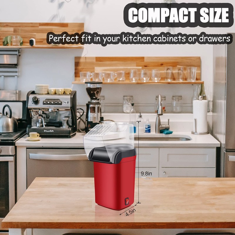 - 【BPA Free& Healthy】Popcorn machine made of BPA-free and any "microwave" chemicals, comply with edible grade standards material. You do not need to add oli, water or other seasonings. Hot air popper to fit in your kitchen cabinets or drawers does not take a lot of space to store away. Dimension is 6.5" X4.5" X 9.8".