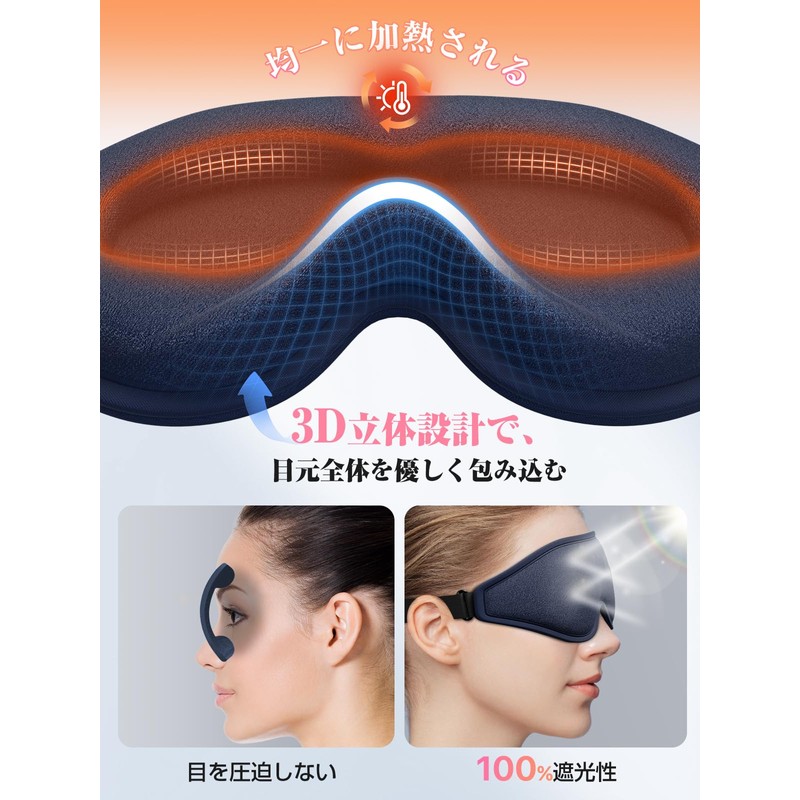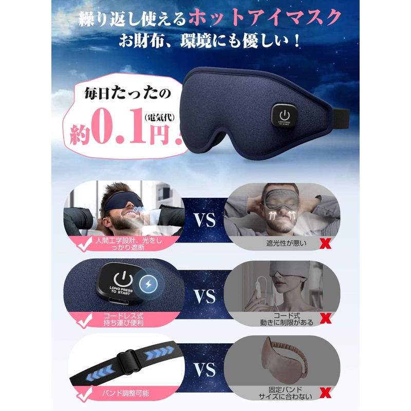 Hot Eye Mask, Rechargeable, 3D Shape, No Pressure, Eye Mask, Relaxing Eye Warmer, Light Blocking, Cordless (Blue)