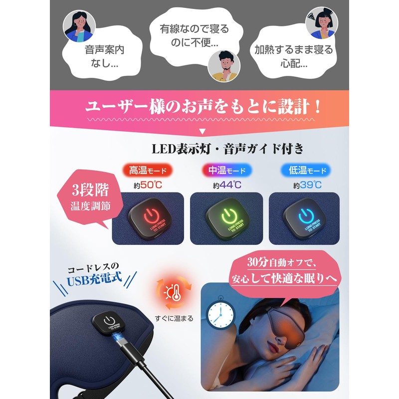 - Eye Mask: 2 adjustable modes of charging, "High Temperature", "Medium Temperature" and "Low Temperature". Auto-off timer automatically turns off after 30 minutes