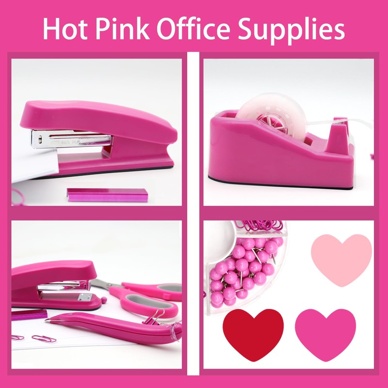 - Package Includes- This hot pink office supplies contains 1x Stapler, 1x Staple Remover, 1000x Staples, 1x Tape Dispenser, 1x Office Scissor, 1x Tape, 4 x Hollow Clip, 6 x Clip, 50 x Paper Clip, 40 x Push Pin, 3 Colors Heart Sticky Notes X 30PCS. Such a complete hot pink desk accessories combination is enough to meet your school and office using needs.