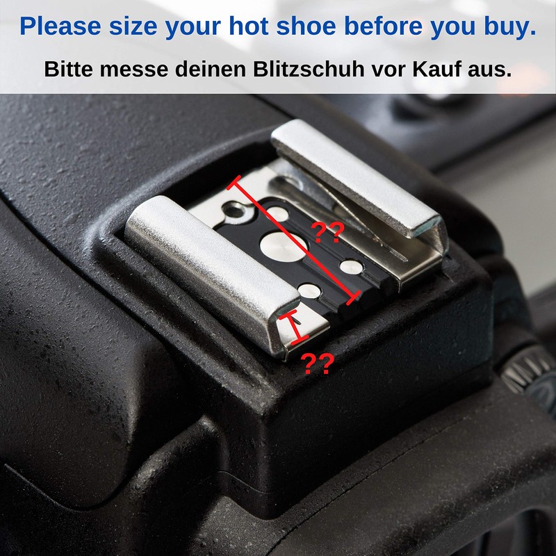 - Special flash shoe with ISO 518 – compare sizes: this hot shoe closure is compatible with many camera models - important. Please measure the hot shoe from the camera.
