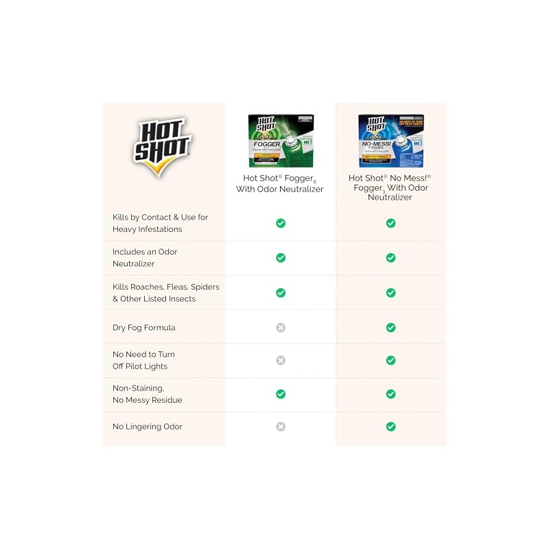 Between the carpool and the couch cushions, you're the CEO of the home front. Take care of your family C and take care of business, no matter where household pests rear their ugly heads. Show bugs who's boss with Hot Shot insecticides. They're your weapon of choice, giving you the clear advantage within your walls and at the bank. Save the day.Hot Shot Fogger6 With Odor Neutralizer creates a ?ne, penetrating mist that reaches deep into cracks and crevices to ?ush out and kill hidden bugs on contact. This product kills ants (except fire ants), black carpet beetles, brown dog ticks, crickets, earwigs, firebrats, fleas, flies, gnats, houseflies, mosquitoes, palmetto bugs, pillbugs, rice weevils, roaches, saw toothed grain beetles, silverfish, small flying moths, spiders and waterbugs. Does not control bed bugs. When used as directed, the clear, non-staining formula will not harm drapes, upholstery, fabrics, carpeting, bedspreads, ?oor tiles, wood ?oors, linens, furniture, walls, clothing, ceilings, shades or blinds.Hot Shot Fogger6 With Odor Neutralizer kills both ?ying and crawling insects on contact and keeps killing for up to 2 months without leaving a wet residue. One can of this product treats up to 2,000 cubic feet of unobstructed space. Read and follow all label directions before using this product. When creepy bugs attempt to pass, save the day with Hot Shot insecticides.