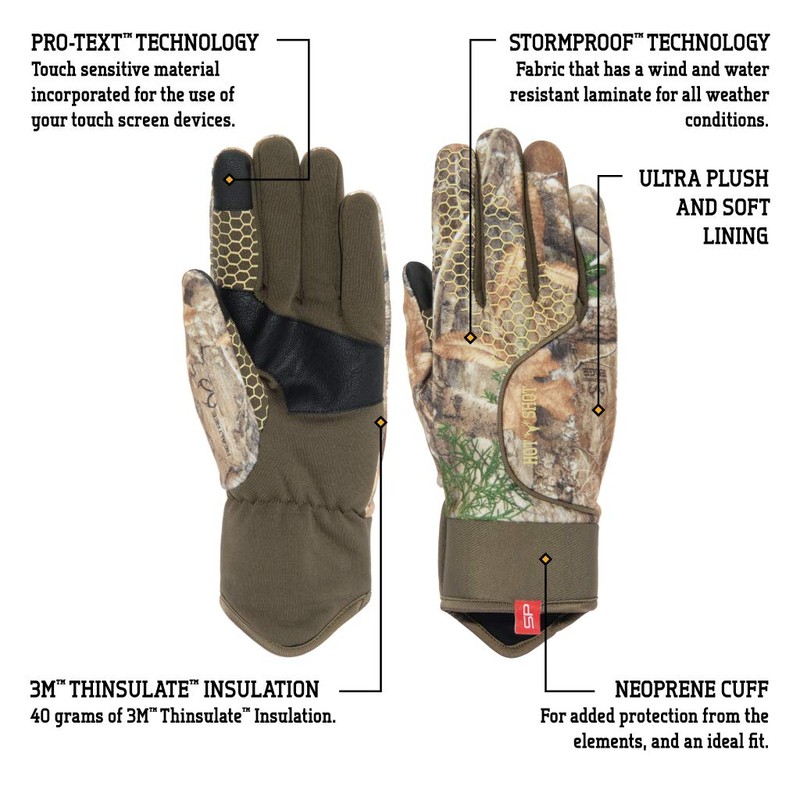 - PRO-TEXT GLOVES: These touch gloves incorporate a touch PU on the index finger and thumb tip with a canteen stretch fleece palm. Pro-Text Technology allows for hunters to use their touchscreen smartphones while wearing the gloves.