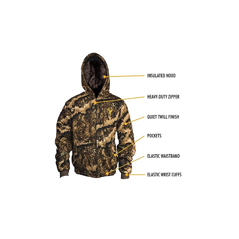- INSULATED: This jacket features a 100% cotton twill shell insulated with a polyester fill and quilted polyester lining. It is a perfect jacket for cold hunting weather. Additional layers are not necessary with this jacket.