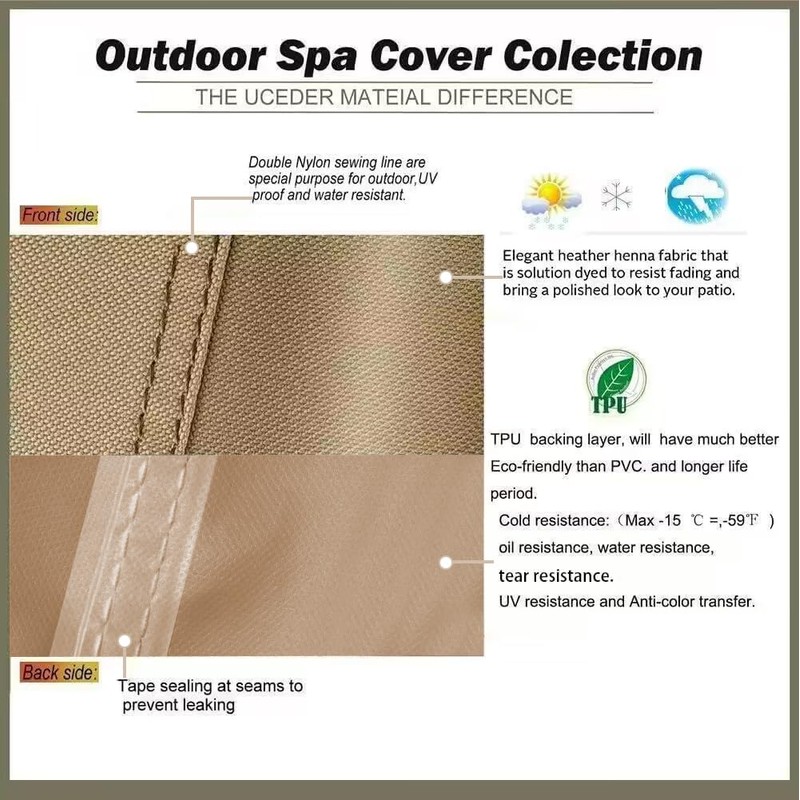 The cap actual size 85"x 85"x 20",fits hot tub cover 83"x83" or less.we are using heavy duty water-resistant polyester fabric.with double UV resist layers.we promise that 100% waterproof and UV resistant! The cap can be lasted 4-5 years even in a harsh environment.the cover cap can protects your Hot Tub from Dirt, Dust, Rain, Hail, Bird Droppings, UV Rays etc.Anti-color transfer to avoid embarrassment of dyein .our best price with high quality, don't hesitate to buy it.pls attention!!!This cover cap can not be used by itself without an insulated hard cover under it.