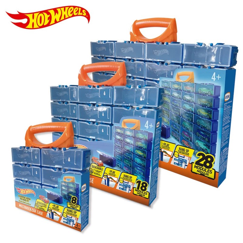 - Conveniently store and carry up to 28 Hot Wheels cars. Build extreme tracks for your cars stacking the modules and using them as bricks. 4 years and up - (cars not included)