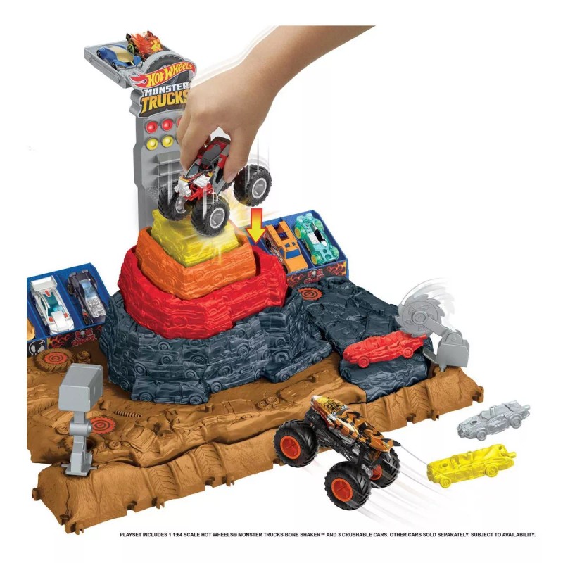 - Accesorios incluidos: Incluye 1 Bone Shaker™ Ultimate Crush Yard™ Arena Smashers™ de Monster Trucks de Hot Wheels®, 1 vehículo Bone Shaker™ de Monster Trucks de Hot Wheels® a escala 1:64 y 3 vehículos para aplastar.