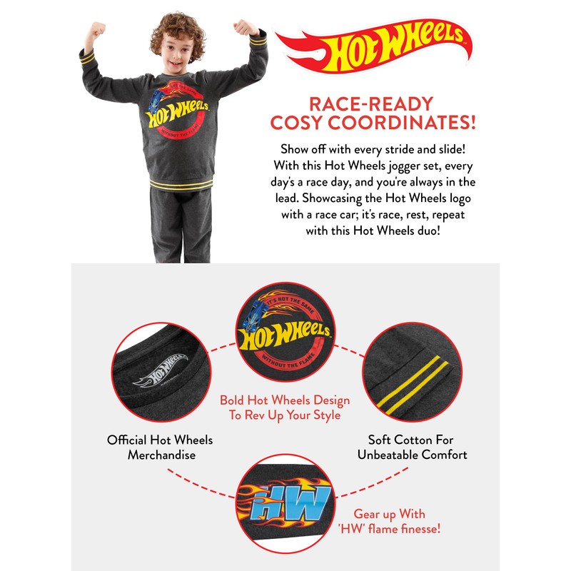 - Official And Exclusive Hot Wheels Clothes: Step into the vibrant, thrilling world of Hot Wheels merchandise with our authentic range of Hot Wheels clothes for boys. This super-cool co-ord set, featuring a high-octane Hot Wheels sweatshirt and matching Hot Wheels joggers, is made to impress every little speedster! Zoom into an adventure with clothes for boys that embody the spirit of speed and freedom!