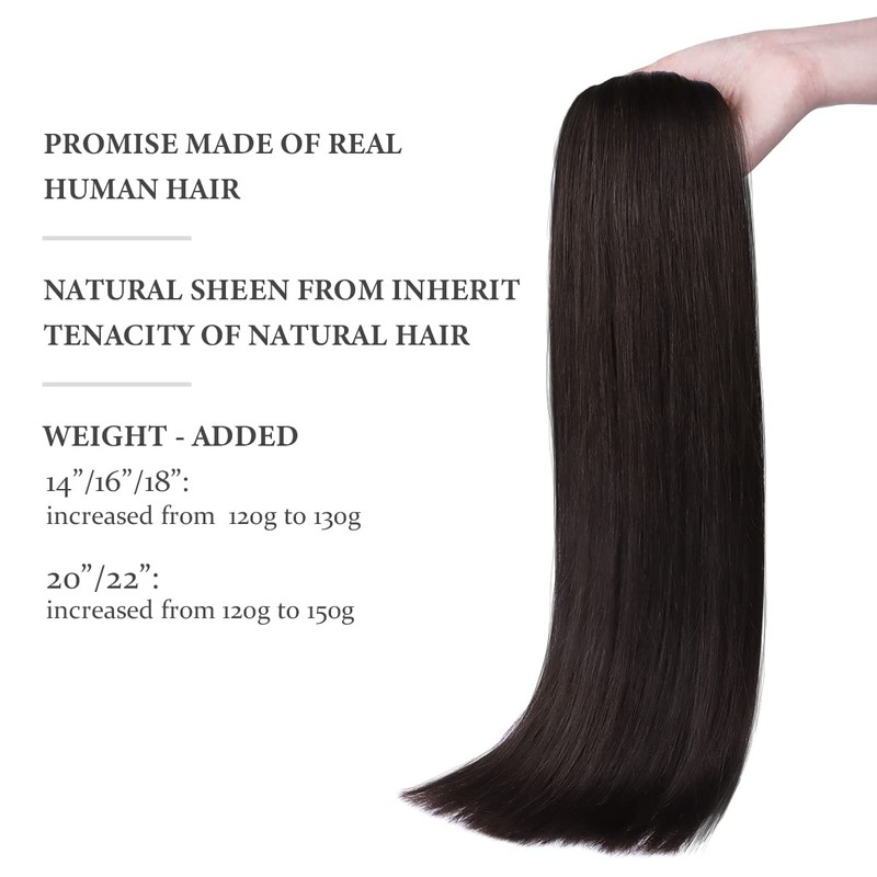 - Thick and Satin Texture & Novice-Friendly. -- Each set of Seamless Clip in hair extensions contains 7 pcs with 16 clips. 14" to 18" weigh 130g/set and 20" to 22" weigh 150g/set. We added grams to hair in longer size to ensure it is full from top to end. You can feel the incredibly thick texture when holding it. Even a novice can master to apply it in home at first attempt, only need to part your hair and then clip the hair extensions in.