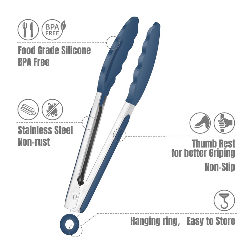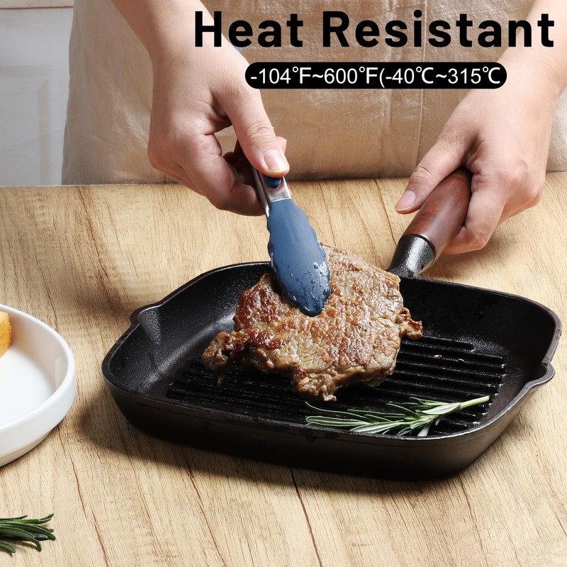 • EASY TO USE: The cooking tongs' handle is cushioned with silicon, good for thumb rest and ensures good grip and control. The Food Grade silicon tongs tip is heat resistance 600°F and less prone to scratch the pan. Easy to rinse, dishwasher safe.