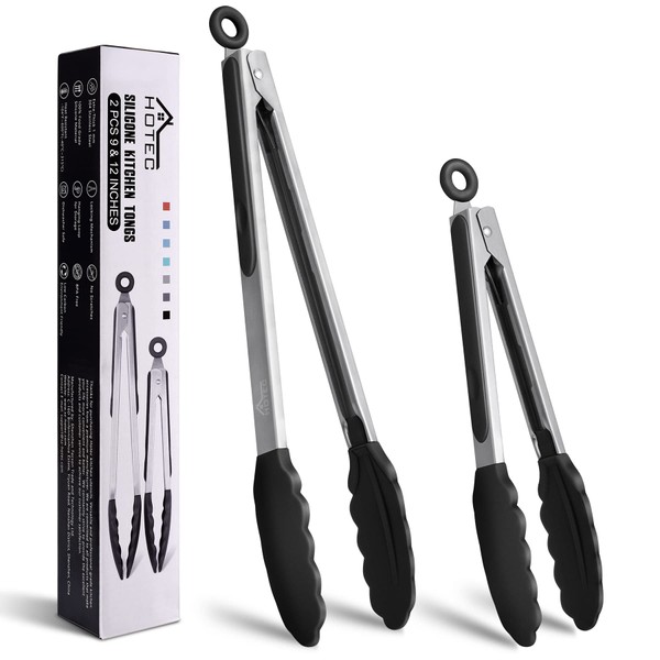 - TOP QUALITY: Hotec kitchen tongs are constructed with high quality stainless steel, sturdy, heat resistance, anti-rust, anti-corrosion, light weight, easy to handle, like new forever. This tongs for cooking comes with 2 sizes, 9 inch and 12 inch.