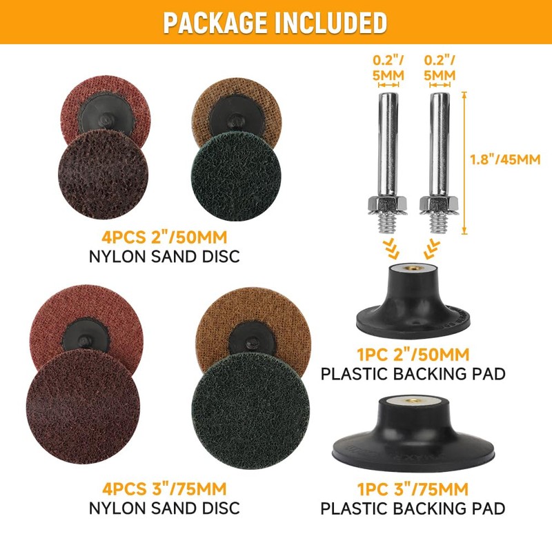• 【Complete Quick Change Disc Set for Versatile Applications】This 10-piece nylon sanding disc set includes a range of coarse, medium, and fine grit discs in both 2-inch and 3-inch sizes, perfect for grinding, sanding, and polishing on a variety of surfaces such as metal, wood, and plastics