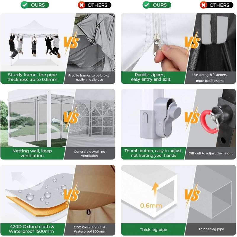 - 【3 Adjustable Heights】Our 10x10 pop up canopy with sidewall has 3 height settings, 94.5inch/7.8ft, 90.6inch/7.5ft, 86.6inch/7.2ft. You can choose to meet the height of demand.