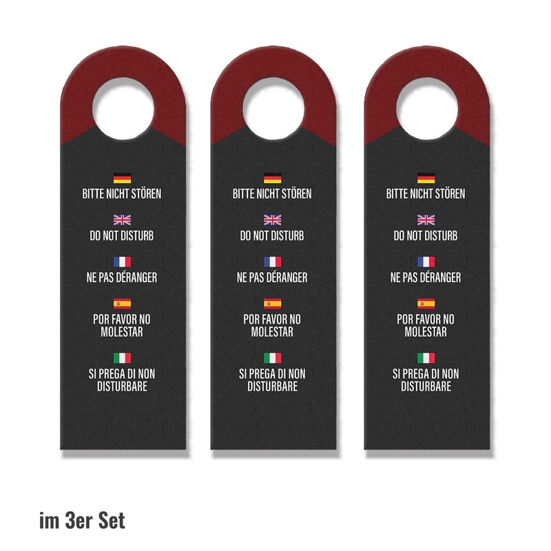 - Box contents: 1x hotel door hanger please do not disturb - please clean room in different languages dark grey with arrow German, English, French, Spanish, Italian, room service maid