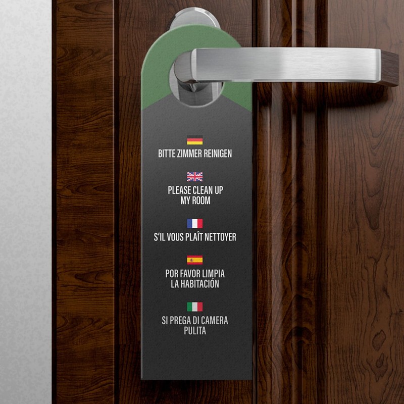 - On the door hanger the instructions are printed in 5 languages and provided with small flag symbols. Please do not disturb - please clean the room.
