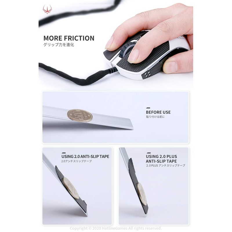 - BETTER GAMING EXPERIENCE - HOTLINEGAMES 2.0 Plus Anti-slip Grips Tape with the diamond texture surface. The new diamond texture design not only has better sweat absorption performance, but also improves the friction coefficient, it will not slip even if your mouse strenuous move. [Recommend to match with Hotline Games Mouse Skates & Gaming Mouse Pad & Mouse Bungee for better gaming experience!]
