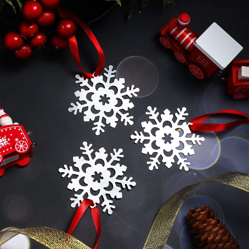 - Easy to Use: the metal snowflake ornaments have a hole in the top, hanging the snowflake is a breeze thanks to the included red ribbon; Simply attach the ribbon to the pre made hole at the top of each snowflake and hang it on your tree, wall, windows, door, staircase, fireplaces, and fences, or even create a captivating wonderland centerpiece, will impress your guests