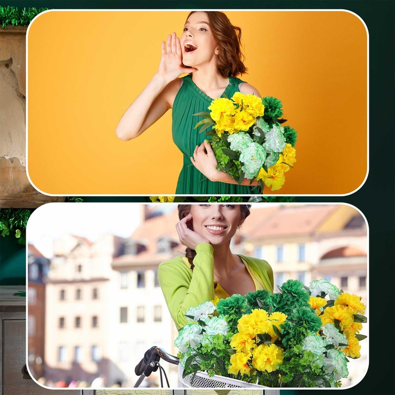 - Mixed Color Bouquet: experience the vibrant festivities of St. Patrick's Day right from your home with 6 pcs beautifully mixed color St. Patrick's Day carnations artificial flowers, 2 pcs St. Patrick's Day four leaf clovers; The arrangement is artistically colored, the carnations have 3 colors, namely green, white green, yellow, 2 pcs in each color, 7 pcs flowers in each stem, capturing the mood of the Irish holiday excellently, suitable for both indoor and outdoor decorations
