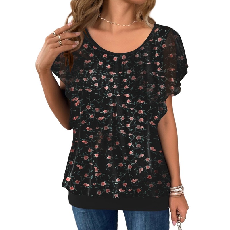 Hotouch Women's Short Sleeve Double Layer Mesh Crew Neck Tops Loose Flowy Cap Sleeve Tunic Summer Elegant Top, Floral Pink281