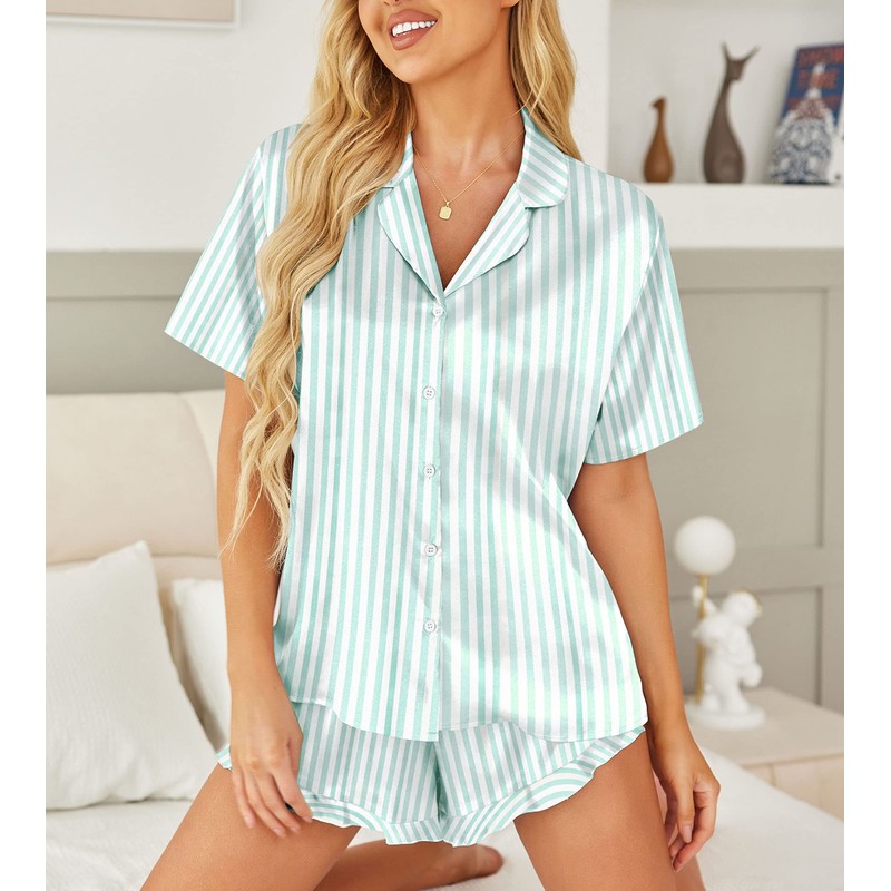 HOTOUCH Womens Satin Button Down Short Sleeve Pink Striped Pajamas Sleepwear Set Green Striped, X-Large