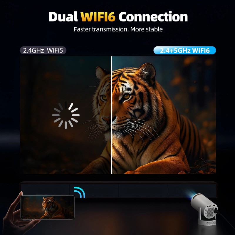 ✨✨✨【Bluetooth 5.0 Dual-Band WiFi 6 & Android 11.0 OS】The projector features a built-in Bluetooth 5.0 chip, ensuring a fast and stable connection for real-time audio and video in complex environments. It supports dual-band 2.4GHz and 5GHz and utilizes WiFi 6 technology for speeds up to 9.6Gbps. This allows for more devices to connect simultaneously, with a wider range, faster speeds, and guaranteed network stability. This mini projector runs on Android 11.0. You can directly access a variety of apps, including popular apps like Prime Video and YouTube, through the projector, allowing you to watch them directly without redownloading.