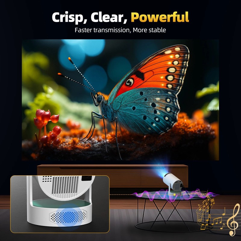 ✨✨✨【External Speaker Design】This newly upgraded portable projector features a groundbreaking independent external speaker design. It completely eliminates the muffled and indistinct sound common in standard projectors, delivering penetrating, clear sound quality and powerful, high-volume performance. Whether it's the roar of explosions and delicate dialogue in a movie, or the melodious melodies at a concert, they're all reproduced with authenticity and richness, instantly transforming your space into an immersive audiovisual experience.