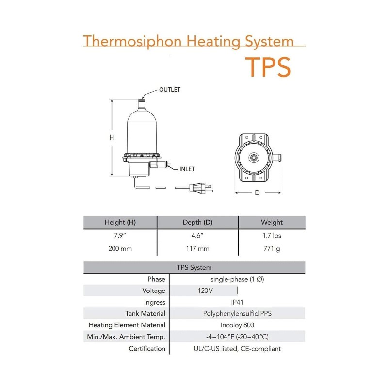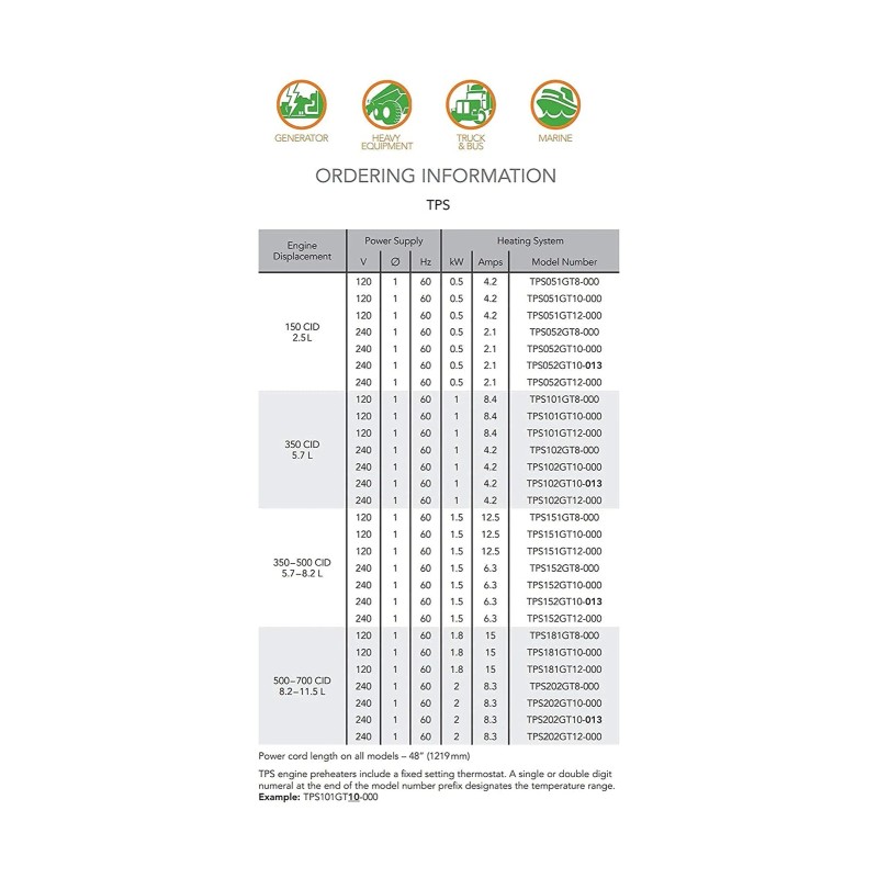 HOTSTART TPS models, are a coolant preheaters developed to maintain optimal temperatures for diesel and gas engines, construction equipment, trucks, heavy duty mobile equipment, marine and industrial applications. HOTSTART engine heaters maintain an engine's operating temperature during downtime and serve as an excellent cold weather or emergency starting aid while eliminating needless idling. HOTSTART TPS models circulate heated coolant using the thermosiphon principle, a method of passive heat exchange which circulates a fluid without the necessity of a mechanical pump. HOTSTART TPS engine heaters provide even heat distribution resulting in reduced engine wear, quick start- ups and reduced emissions. The compact design is ideal for locations that require minimal mounting space. Specs: Heating Element: Incoloy 800 Enclosure: IP41 Resists corrosion Fluid Capacity: 0.11 gal (0.42 L) Maximum Pressure: 90 psi (620 kPa) Inlet/Outlet Plumbing: 0.625” (15.9 mm) Tank Material: Polyphenylensulfid PPS L-C/US listed CE compliant. Power cord length on all models – 48” (1219mm)