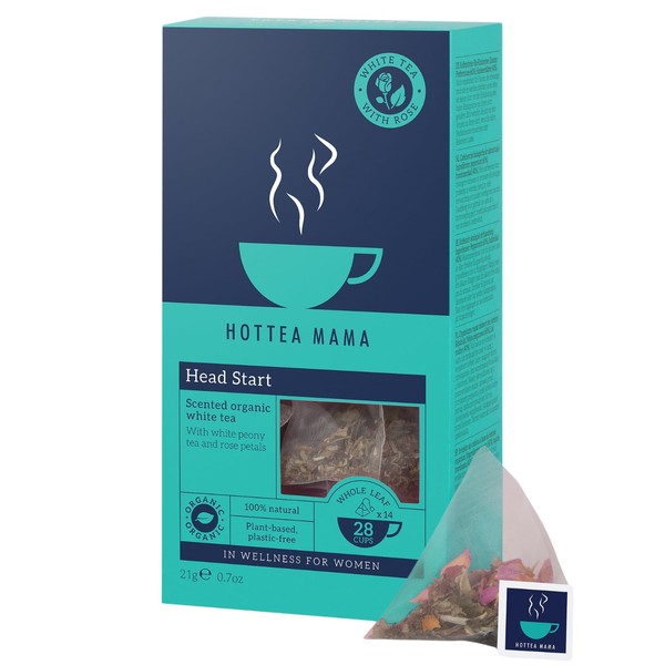 HOTTEA MAMA | Head Start | Organic | Slow Release Caffeine Blend | For Tiredness Support | White Tea and Rose | 15 Whole Leaf Biodegradable Pyramid Bags