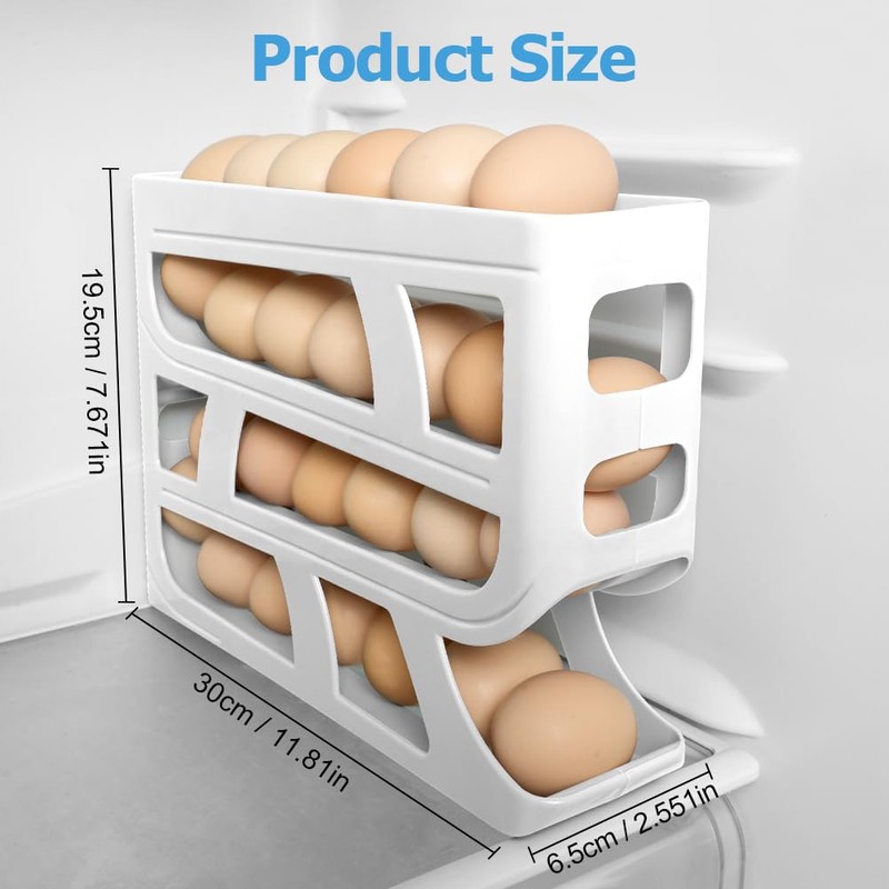 - 4-level tilt design - Our 4-level egg holder fridge has an automatic roll design, on each level there is a barrier design on the side, which ensures order and stability between the eggs and reduces the risk of damage. After removing an egg, the next egg automatically rolls forward, which is convenient for retrieving.
