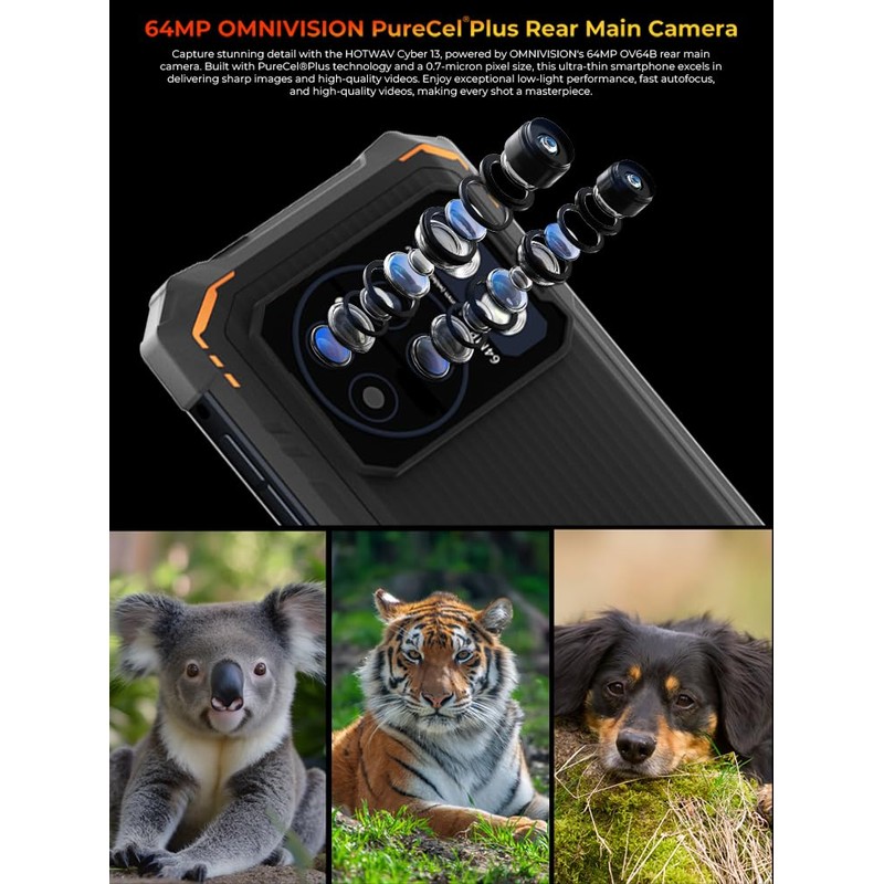 - 64MP + 16MP rear camera: The HOTWAV Cyber 13 smartphone is equipped with a 64MP flagship camera equipped with 2 infrared lights and 2 LED lights, which means that we can take photos of the scene even at night, in the deepest darkness, 20 metres away.