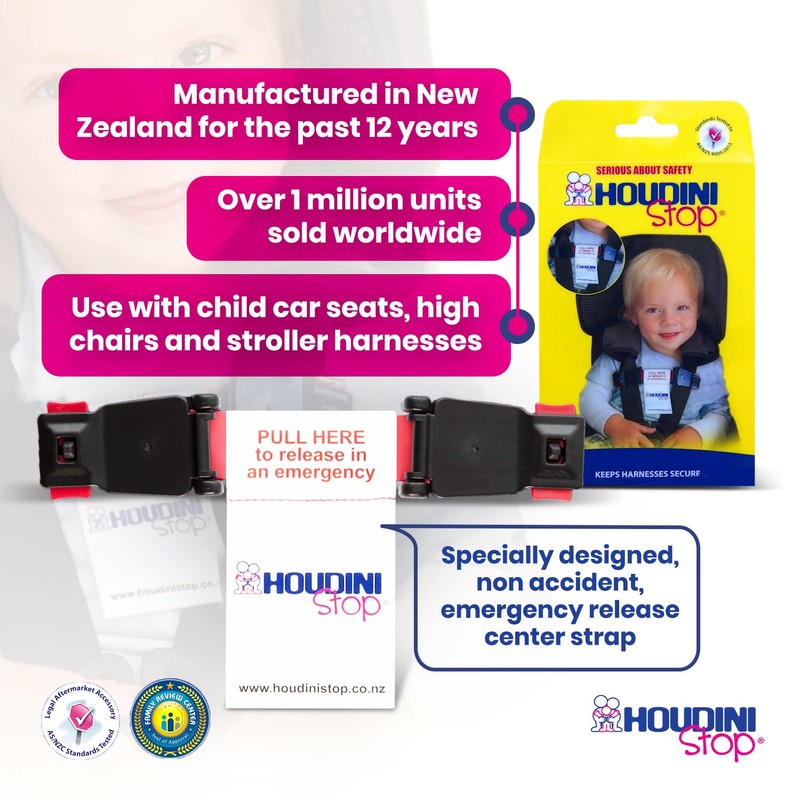 - MADE IN NEW ZEALAND & INDEPENDENTLY TESTED: Different from cheaper imitations, the original Houdini Stop is made to high standards of safety and independently tested. It does not interfere with the normal performance of the car seat in any way. Avoid imitations and choose the original Houdini car seat chest clip lock. Add to cart now