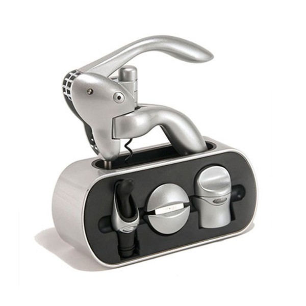• With a Houdini lever corkscrew, wine pourer/stopper, foil cutter, wine/champagne sealer, spare spiral, and tool stand, this set makes a great gift for wine experts and beginners.