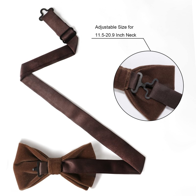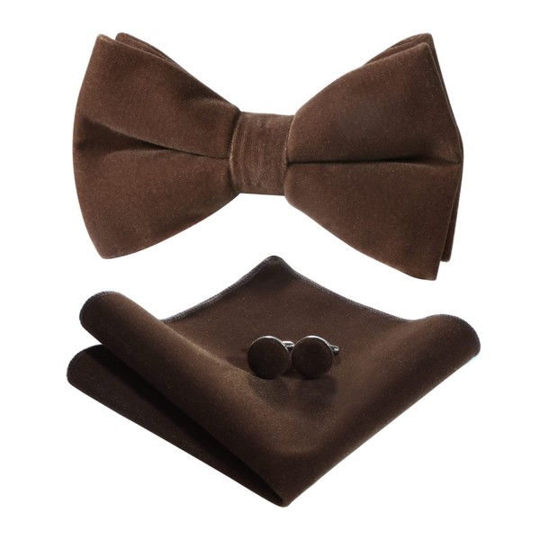 HOULIFE Men's Pre-tied Bowties Velvet Solid Color Adjustable Bow Tie and Pocket Square with Cufflinks for Wedding Party (Brown)
