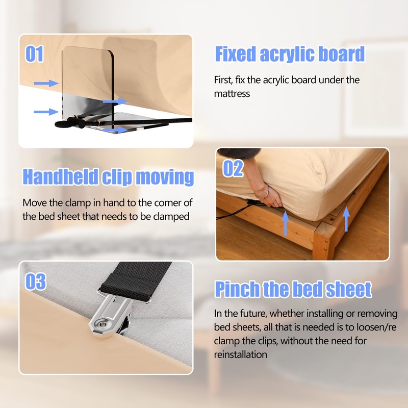 - TIGHTEN THE BED SHEET COVER 360 DEGREES: Patented sheet straps create full-edge tension control. The reinforced pig nose buckle locks corners in 8 directions, place the acrylic panels on both sides of the bed. Eliminating wrinkles and slippage even during restless sleep. Say goodbye to midnight sheet adjustments!