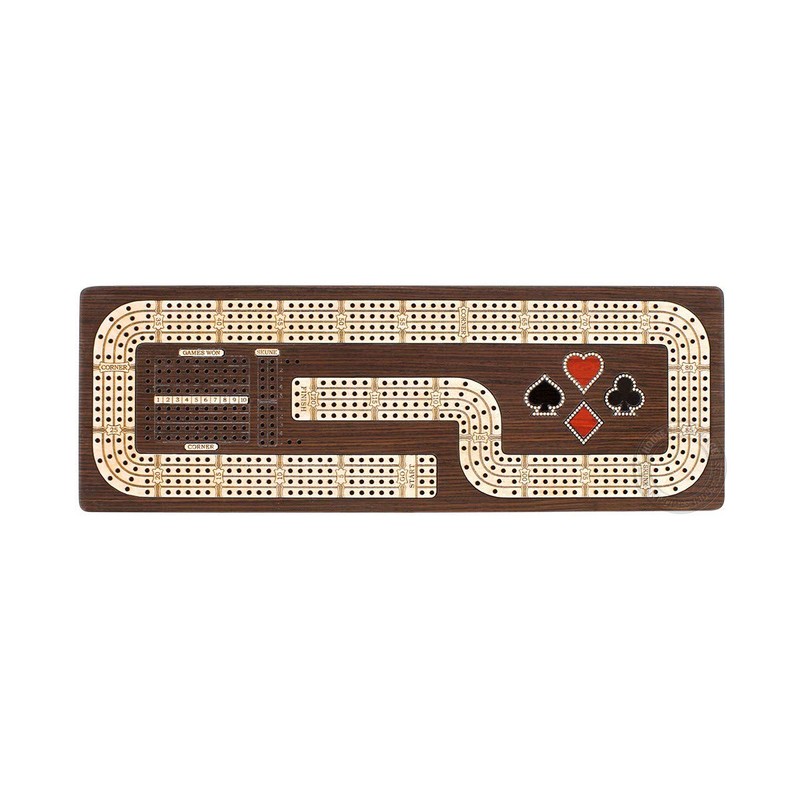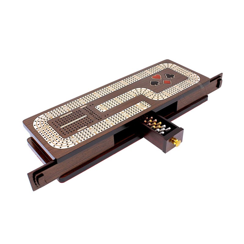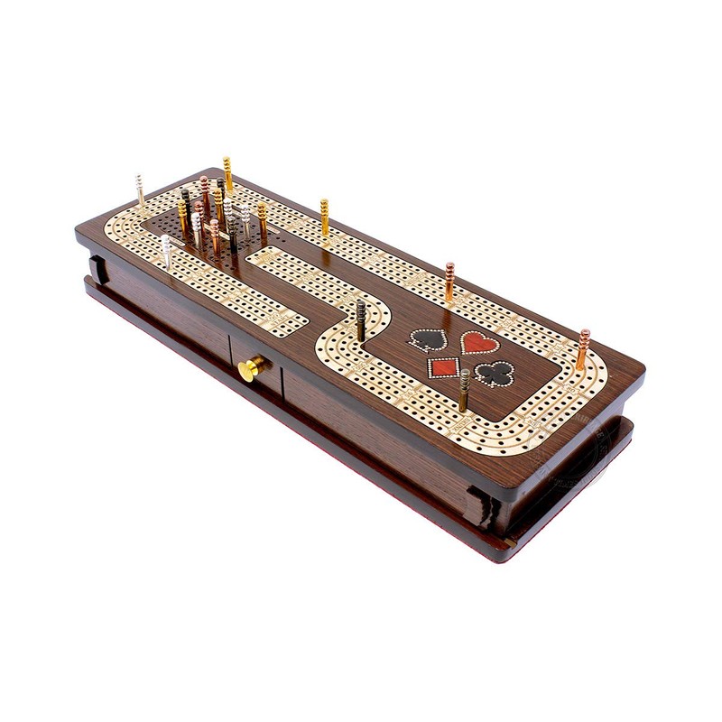 House of Cribbage - Continuous Cribbage Board/Box Inlaid in Wenge Wood/Maple : 4 Track - Cards & Pegs Storage Drawer with Score Marking Fields for Skunks, Corners and Won Games