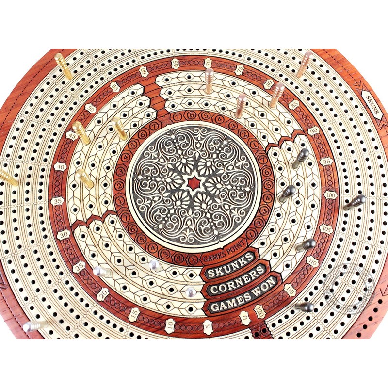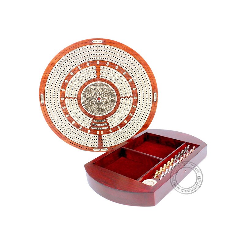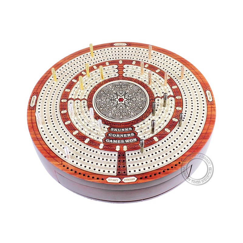 House of Cribbage - Round Shape 4 Tracks Continuous Cribbage Board Bloodwood / Maple with Push Drawer & Place for Skunks, Corners & Won Games