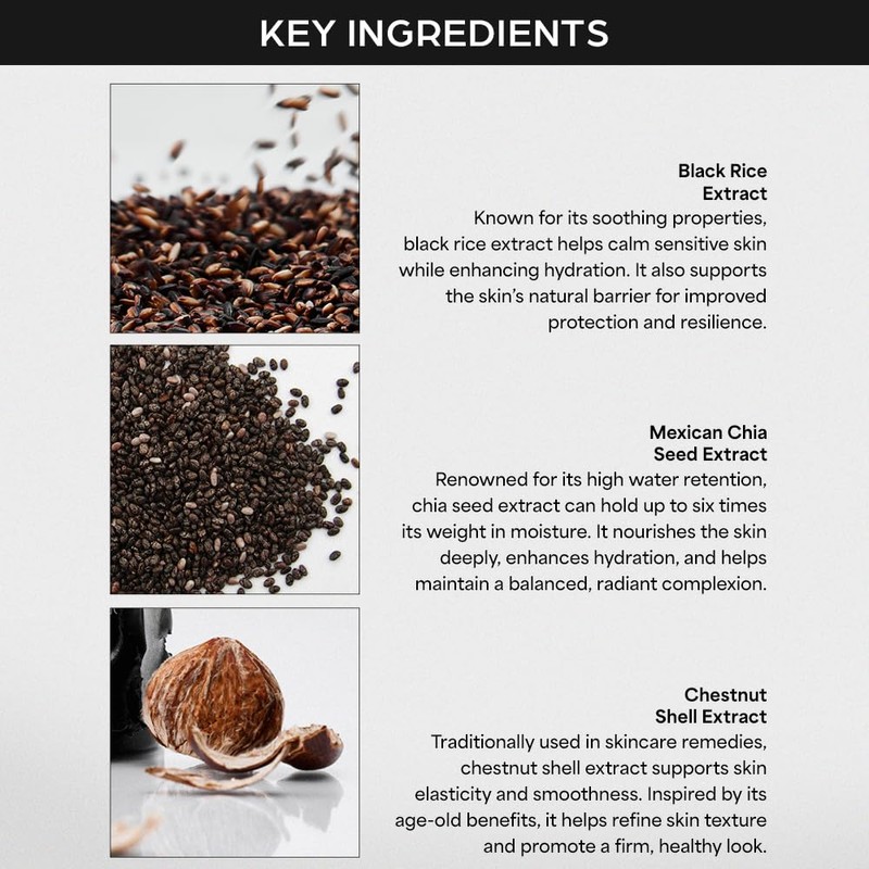 Known for its soothing properties, black rice extract helps calm sensitive skin while enhancing hydration. It also supports the skin's natural barrier for improved protection and resilience.
