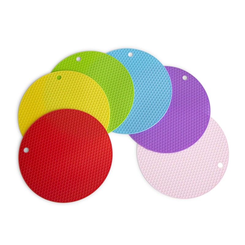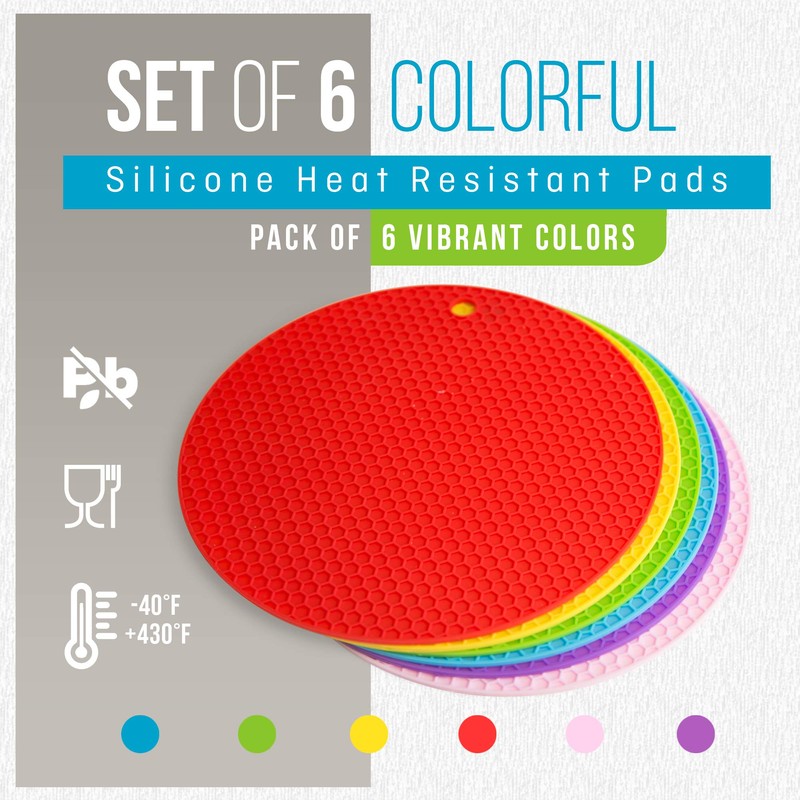 - MULTIPURPOSE: 6 vibrant colors can enrich your kitchen. The silicone trivet mat protects your table, hands, pans and countertops. It has wide-ranging uses: as a potholder, placemat, teapot mat, spoon rest, trivet, large coaster, jar opener, gripper pad and so on. Besides, you can use it to grip hot pans or soup pots, open bottle caps.