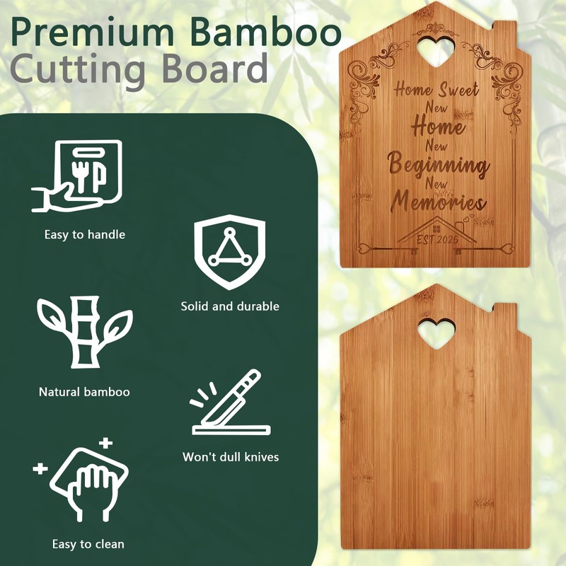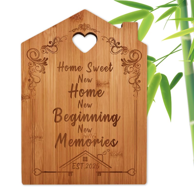 Perfect for chopping, slicing, or serving, this board is a versatile addition to any kitchen. Its eco-friendly material appeals to sustainability-minded homeowners, while the smooth, splinter-free surface guarantees safe food handling. Whether gifted to a friend, couple, or new homeowner, this bamboo cutting board is a meaningful way to celebrate their new beginning.