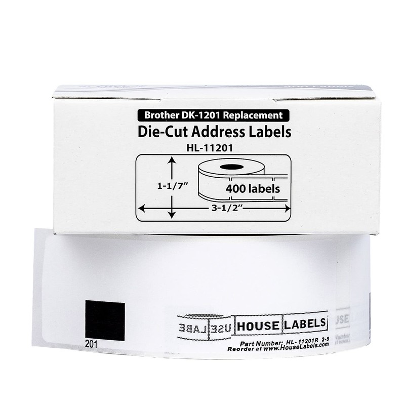 HOUSELABELS Compatible with DK-1201 Replacement Roll for Brother QL Label Printers; 400 Removable Adhesive Address Labels; 1-1/7" x 3-1/2" (29mm*90mm) with 1 Reusable Cartridge - 6 Rolls