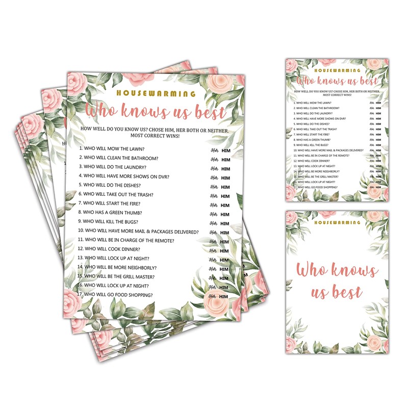 - Package includes - You will receive 30 double-sided games cards. The theme of the game is “Who Knows Us Best”. Get endless fun with a set of housewarming games to entertain your guests.