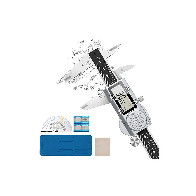 - IP54 Waterproof & Stainless Steel Material: Stainless steel digital caliper with IP54 grade protection, sturdy frame and a lockable head, which can resist water, dust, oil, and rust. The shell is made of metal with silver painted to prevent corrosion, allowing you to slide calipers smoothly!It is very suitable for engineers, carpenters, households, professionals, etc.