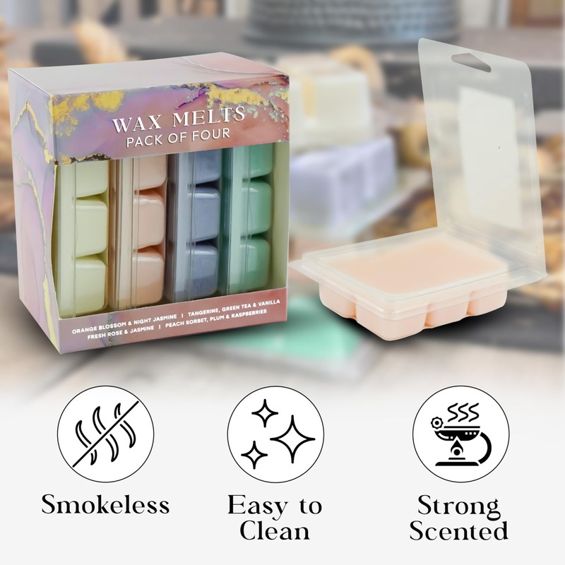 - This pack comes with 8 segment pots - each scented wax melt has six small wax cubes that are easy to break apart to mix fragrances. Contains 4 different fragrances: (Orange Blossom, Jasmine, Mandarin, Green Tea, Vanilla, Fresh Rose, Peach Sorbet, Plum & Raspberry).