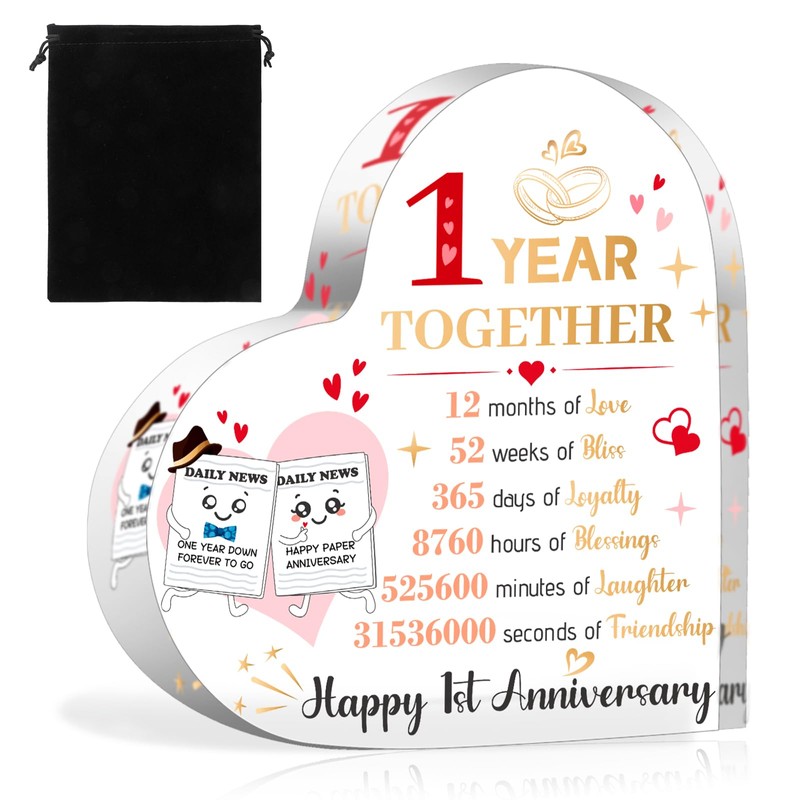 - 【1st Anniversary Gifts for Her Him】Celebrate the one-year anniversary with our Heart Shaped Acrylic Block featuring a delightful daily news one year down forever to go keepsake design. You will receive 1pcs Happy 1st Anniversary Acrylic Heart-Shaped Plaque, with a black velvet pouch, perfect 1 year together romantic gift for boyfriend, girlfriend, husband, or wife.