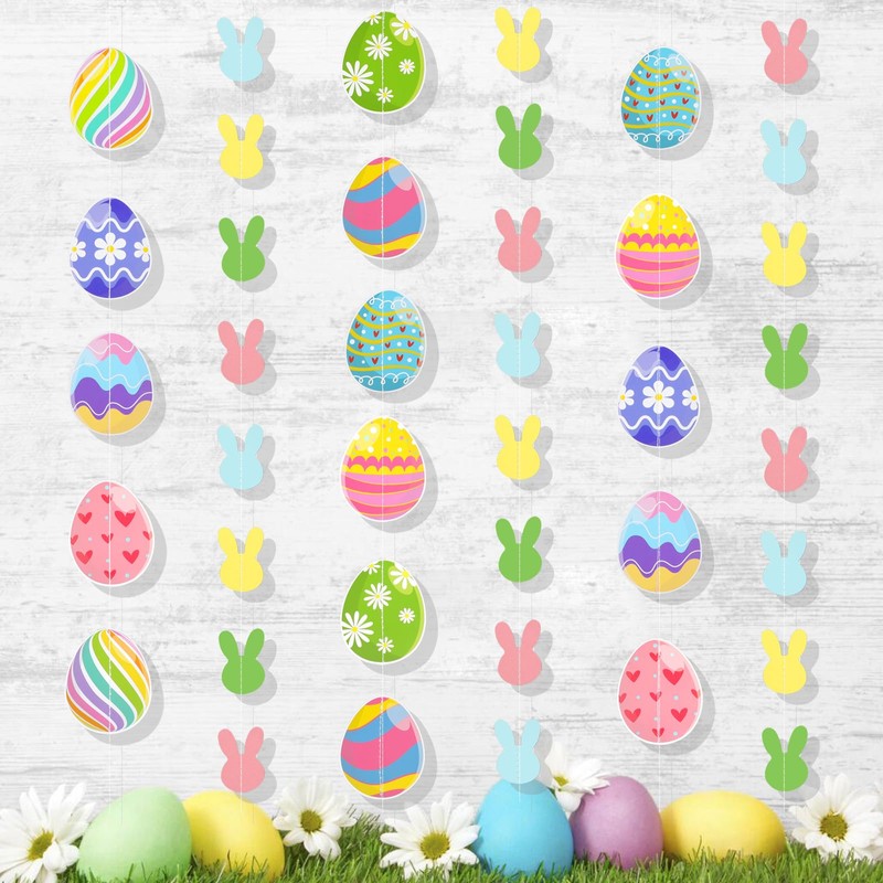 - Easter Decorations: You will get 2pcs Easter Egg Garland Hanging Streamers + 2pcs Easter Bunny Garland Hanging Streamers, each string is 2 meters, a whole set suitable for Easter Decorations, Easter Egg hunt decorations or Easter Bunny Decorations.