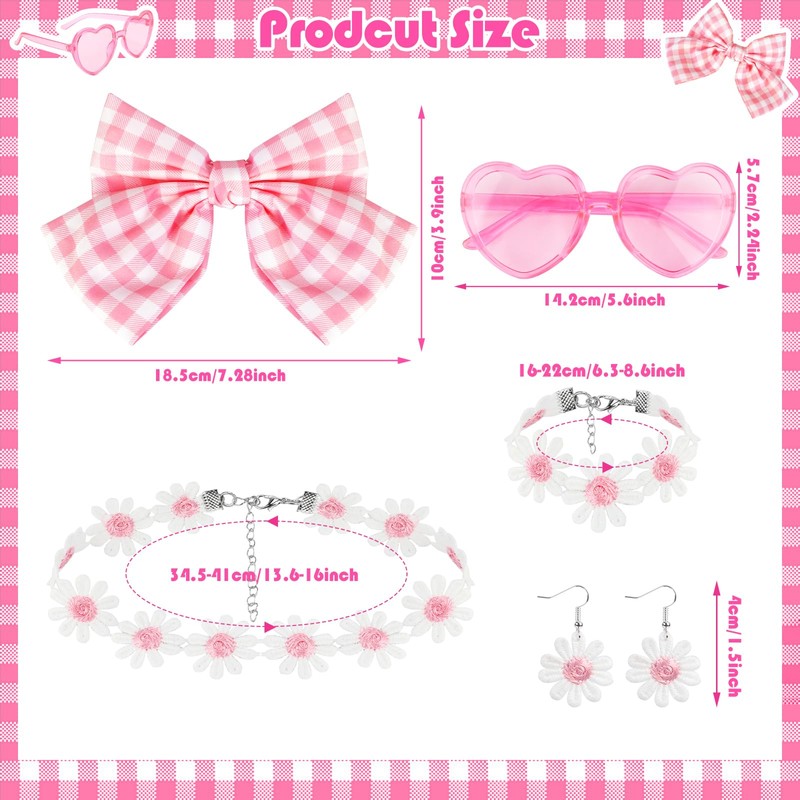 - 【Pink Costume Accessories Materials】 Our Pink Hair Bow Hair Clips, Pink Flower Necklace, Pink Flower Earrings, pink Flower Bracelet, Pink Heart Sunglasses are made of quality polyester fibre, plastics material, Pink Temporary Tattoos have been strictly tested, safe for skin, please use with confidence! The Pink Princess Tattoos Girls Tattoos can last for 3-5 days, waterproof and safe for kids adult.