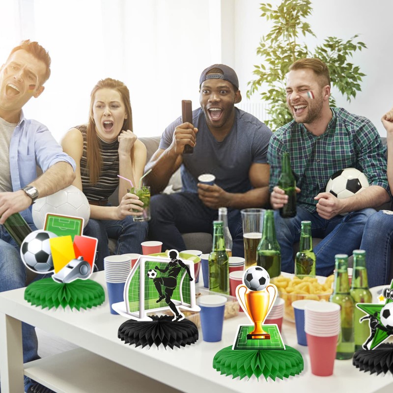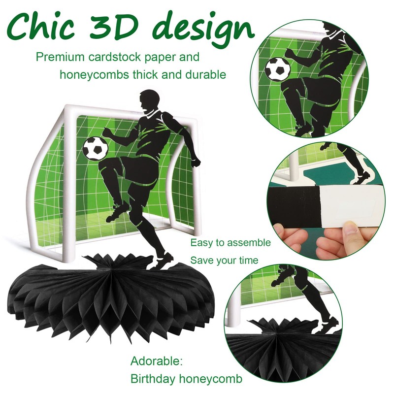 - Buy With Confidence: Soccer centerpieces for table will definitely add more fun to your birthday party and soccer party decorations! Any problem just email us about our Soccer Honeycomb centerpieces. More soccer party decoration supplies such as soccer photo booth props, soccer gift bags please visit Howaf storefront.
