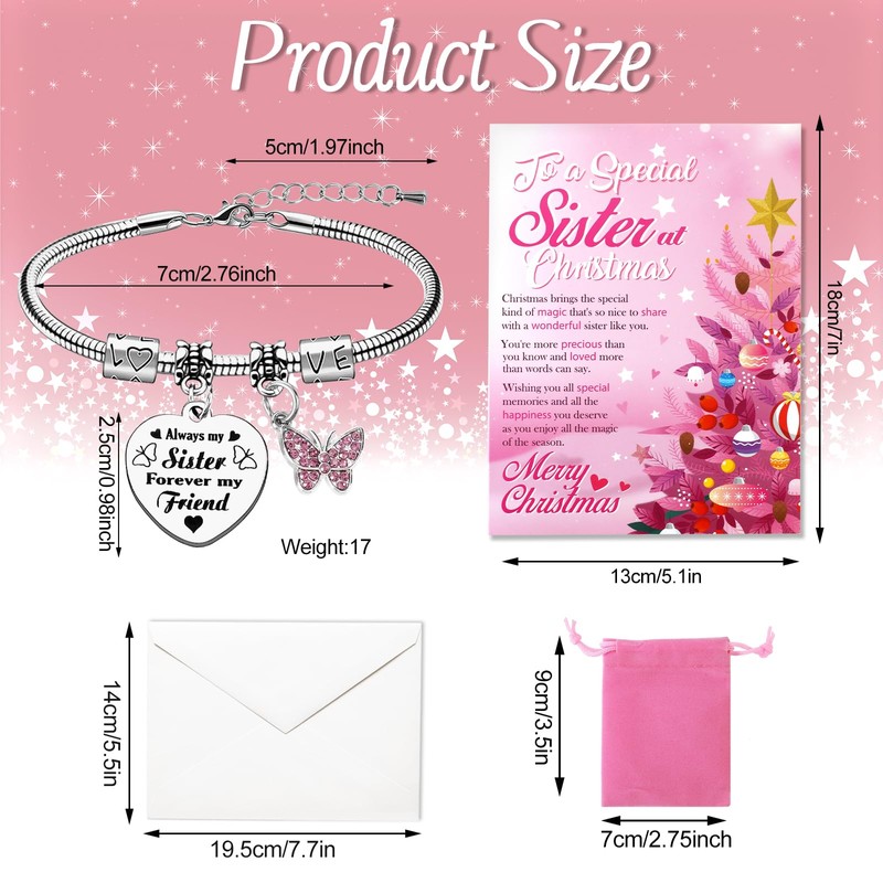- Christmas Gifts for Sister: You will get 1pcs Christmas Card Sister with envelope +1pcs Sister Bracelet with an exquisite pink velvet bag, which are perfect as Sister Gifts or Christmas Gifts, and also as a means for declarations of love.